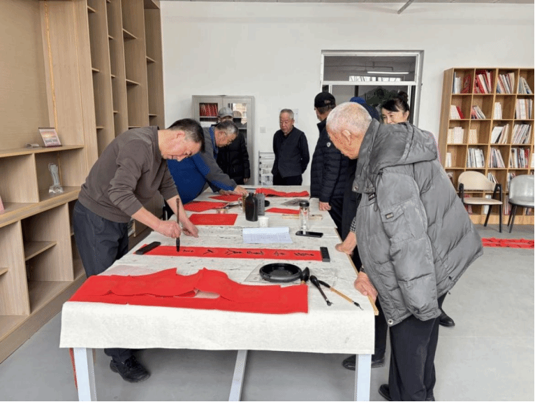 闻讯而来的离退休教职工们围聚在书桌旁,或静静观赏书法创作的精妙过程,或与老友交流心仪的联句内容,或排队等候领取专属春联,现场欢声笑语不断,其乐融融。